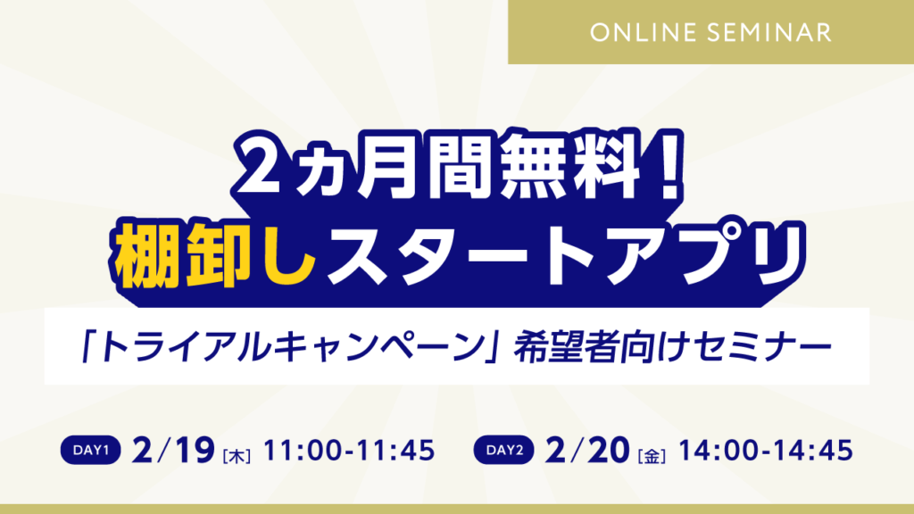 | タイトル | 棚卸しスタートアプリ「2か月間無料トライアルキャンペーン」希望者向けセミナー |